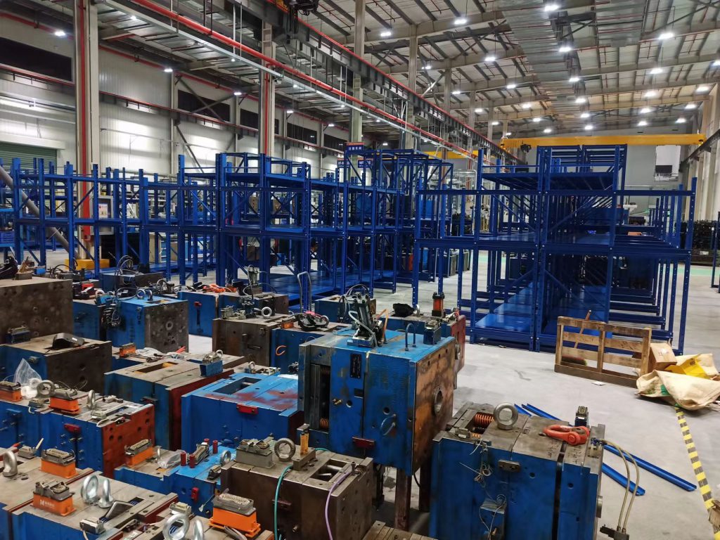 2023年2月23日,我們來到了江蘇南通,為汽車零部件廠注塑車間安裝模具架,我們可以看到客戶的模具都堆放在地上,占用了大量的廠房空間;