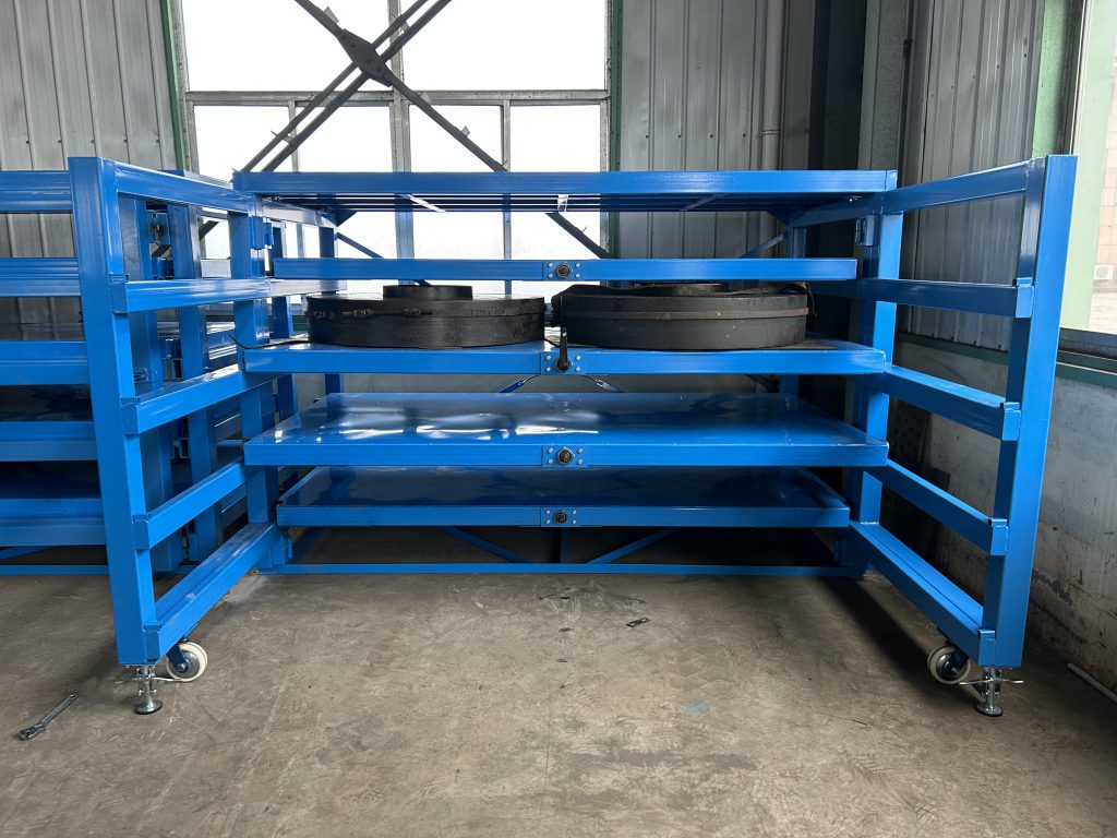 客戶是做廢水處理容器設(shè)備的,手搖模具架放置大型法蘭以及墊片